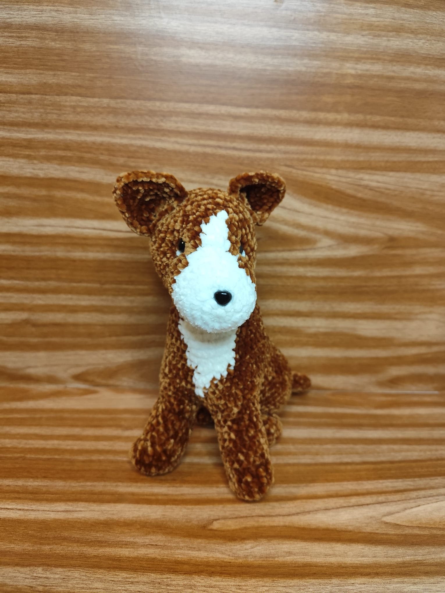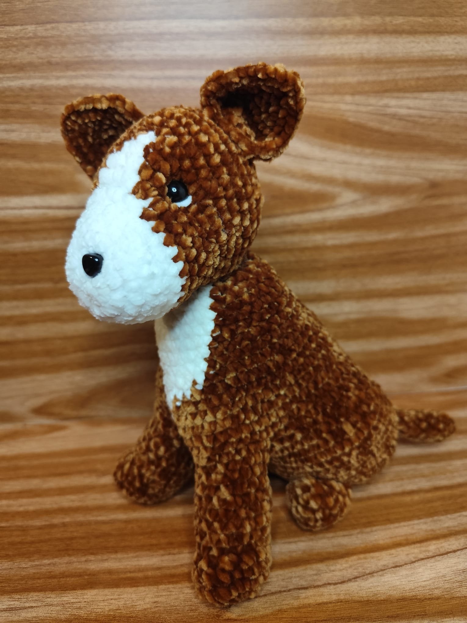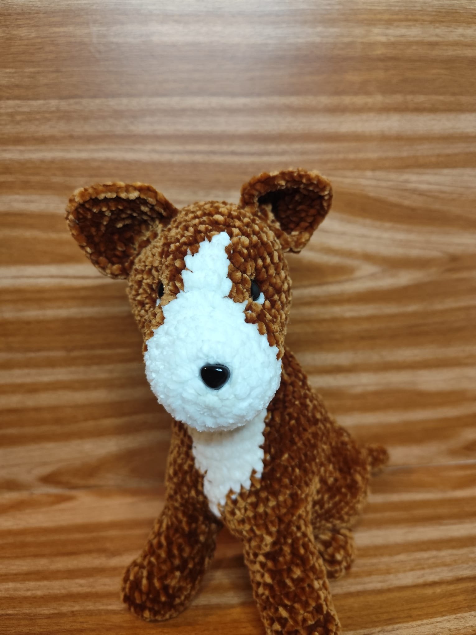 🧡 Ce petit chien marron et blanc crochetĂ© Ă  la main semble prĂȘt Ă  apporter une touche de douceur et de tendresse Ă  votre intĂ©rieur avec son regard attendrissant et son allure pleine de charme.